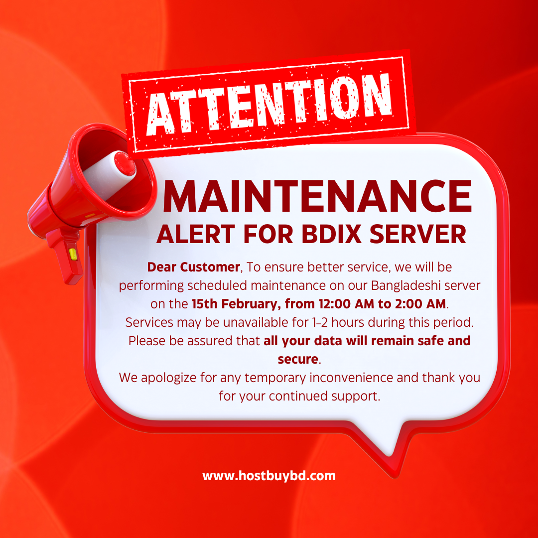 প্রিয় গ্রাহক, উন্নত সেবা নিশ্চিত করতে আগামী ১৫ তারিখ রাত ১২টা থেকে ২টা পর্যন্ত আমাদের বাংলাদেশি সার্ভারের উন্নয়নমূলক কাজ চলবে। এই সময়ে সার্ভিসটি ১-২ ঘণ্টা বন্ধ থাকতে পারে। তবে আপনার সব ডাটা সুরক্ষিত থাকবে।